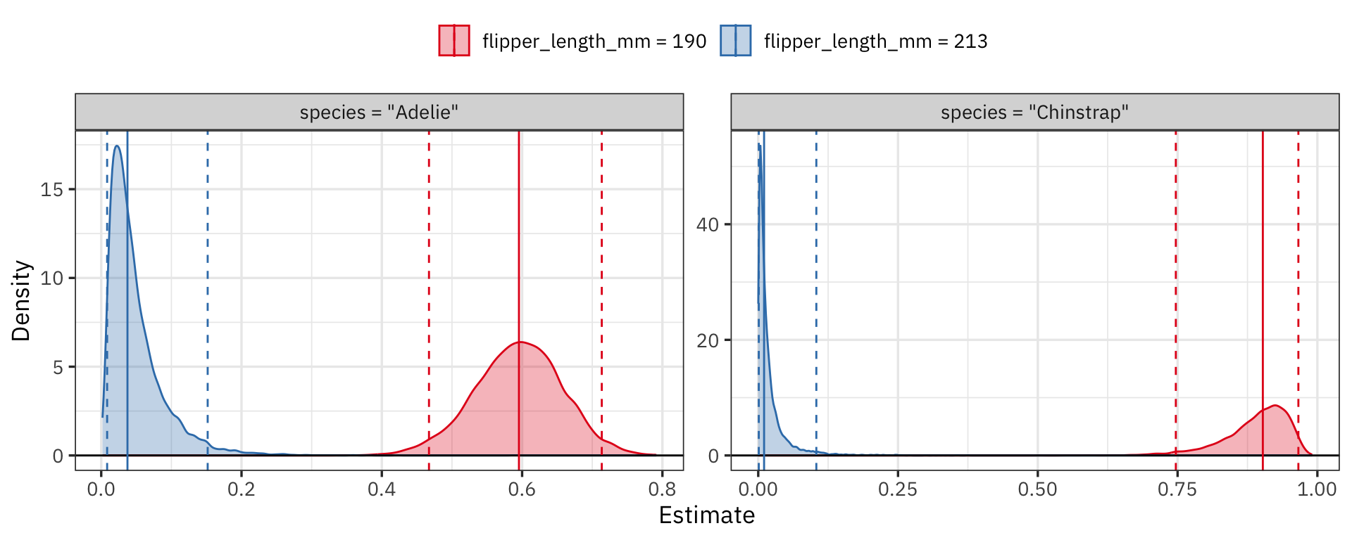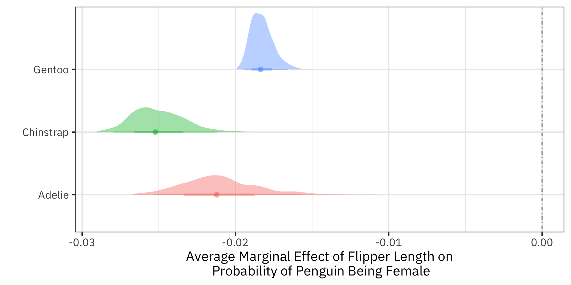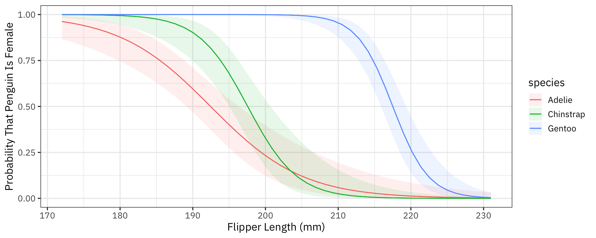 Here, we’re fitting a crude model to map how the association between flipper length (our focal predictor) and sex (our outcome of interest) is moderated by the species a penguin belongs to. We account for time trends, too.