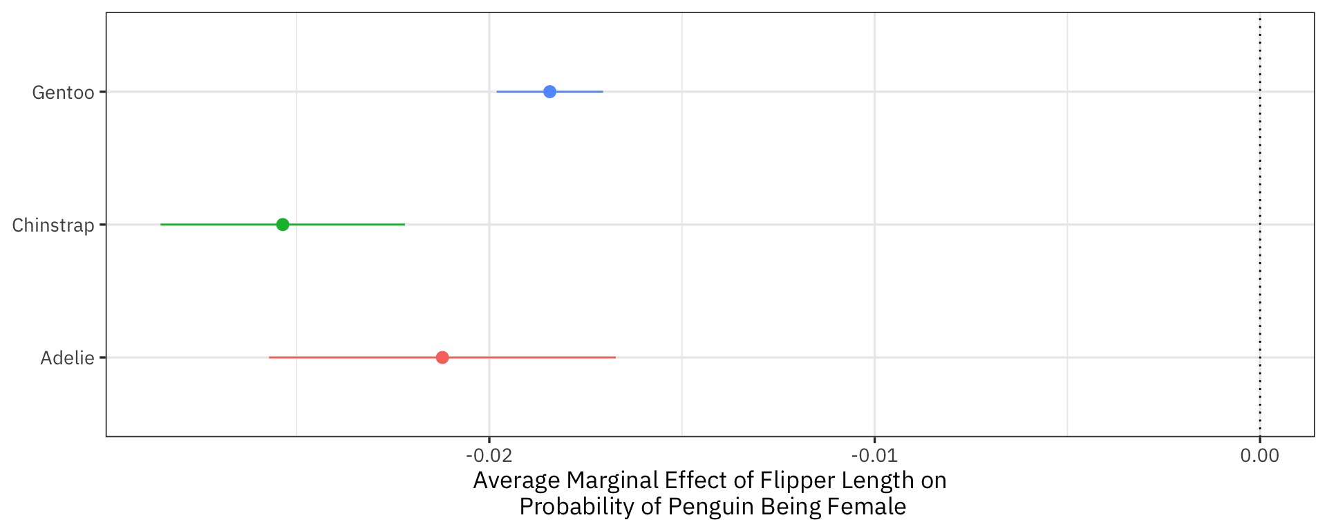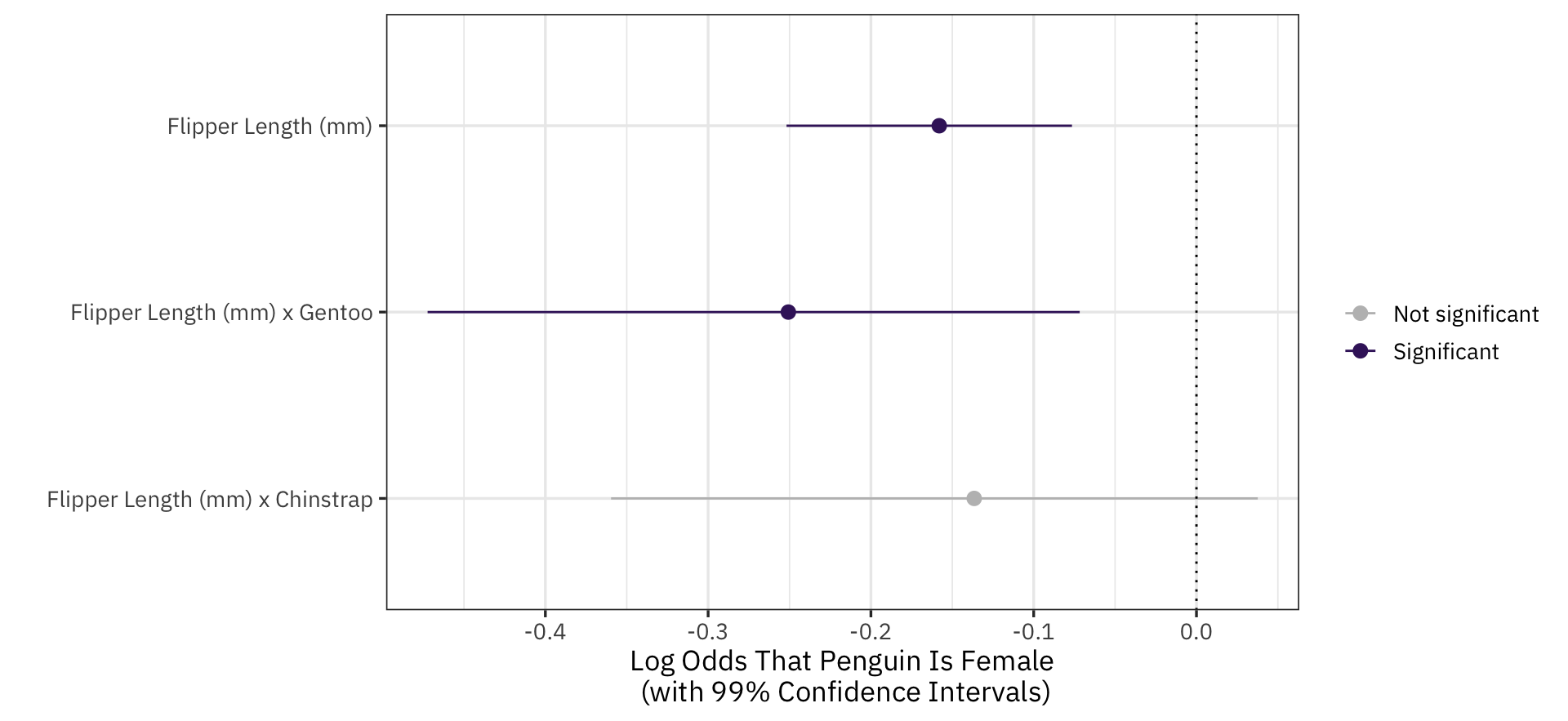 # For more information, see: https://popagingdataviz.com/day3.htmlvar_labels <-rev(c("flipper_length_mm"="Flipper Length (mm)", "flipper_length_mm:speciesGentoo"="Flipper Length (mm) x Gentoo","flipper_length_mm:speciesChinstrap"="Flipper Length (mm) x Chinstrap"))modelplot(model,# Variable names:coef_map = var_labels,# 99% confidence interval:conf_level =0.99) +# Marking significance; line:geom_vline(xintercept =0, lty ="dotted") +# Marking significance; colour scheme:aes(colour =ifelse(p.value <0.01, "Significant", "Not significant")) +scale_colour_manual(values =c("grey", "#3f1f69")) +labs(colour ="", x ="Log Odds That Penguin Is Female\n (with 99% Confidence Intervals)") +theme_bw(base_family ="IBM Plex Sans",base_size =13)